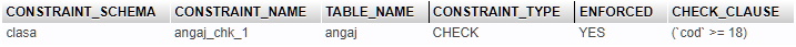 SELECT tc.constraint_schema, tc.constraint_name, tc.table_name, tc.constraint_type, tc.enforced, cc.check_clause FROM information_schema.TABLE_CONSTRAINTS AS tc LEFT JOIN information_schema.CHECK_CONSTRAINTS AS cc ON tc.CONSTRAINT_SCHEMA=cc.CONSTRAINT_SCHEMA AND tc.CONSTRAINT_NAME=cc.CONSTRAINT_NAME WHERE tc.TABLE_NAME='angaj' AND tc.CONSTRAINT_TYPE='CHECK'; |